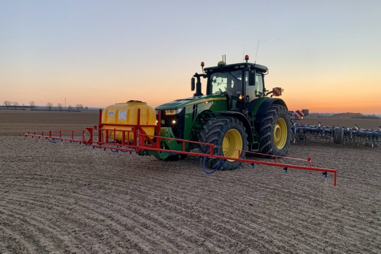 Aplikácia čelným aplikátorom: Možná je aplikácia pomocou aplikátora s objemom nádrže 400 a 600 litrov s regulovatelným pracovným záberom do 10 m umiestneným na trojbodovom prednom závese traktora (nie je potrebný predný kardanový vývod, pretože aplikátor je vybavený vlastnou riadiacou jednotkou s elektromotorom, ktorý je napojený na batériu traktora). Do nádrže aplikátora sa aplikuje koncentrát AZOTERu.