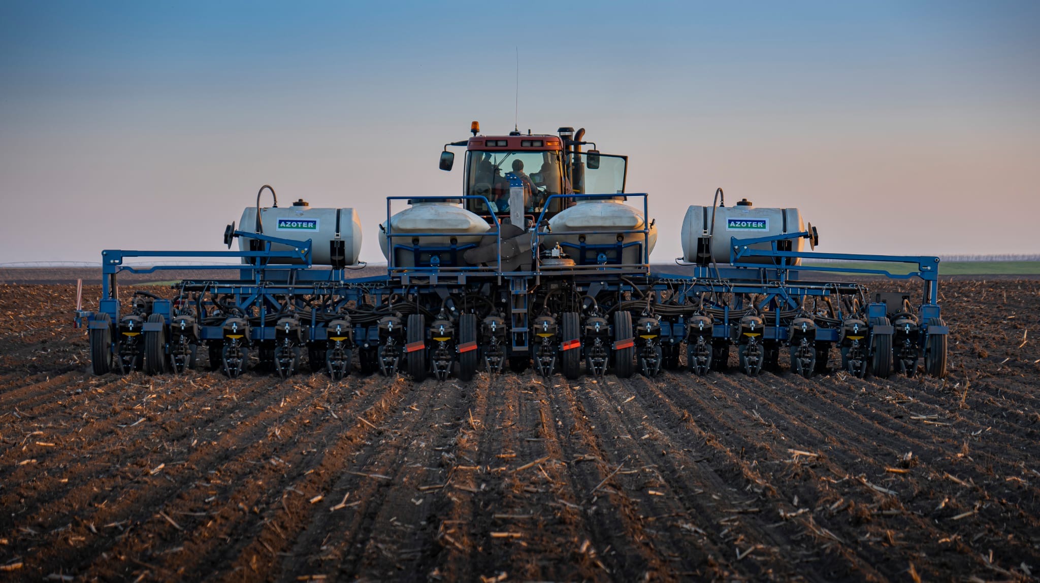 Aplikácia čelným aplikátorom: Možná je aplikácia pomocou aplikátora s objemom nádrže 400 a 600 litrov s regulovatelným pracovným záberom do 10 m umiestneným na trojbodovom prednom závese traktora (nie je potrebný predný kardanový vývod, pretože aplikátor je vybavený vlastnou riadiacou jednotkou s elektromotorom, ktorý je napojený na batériu traktora). Do nádrže aplikátora sa aplikuje koncentrát AZOTERu.